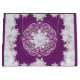 Snowflake with my drawing of a stained glass window from an old European church: a rose window, with touches of a wide variety of colours, including shades of cardinal red and pink, on a cardinal red background. Inlay of white rhinestones (drawn). For an old times winter pattern. This motif is also available in navy blue in my “blue rosace” collections.