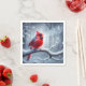 A red cardinal bird singing on a winter tree branch singing with musical notes