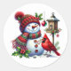 This sticker is shown with a festive holiday cardinal bird with a snowman art print.