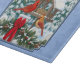 A pair of Northern Red Cardinals perch on a snow-covered white picket fence adorned with Christmas garland and a bright red bow. They feast at a winter bird feeder decorated with Christmas bells, ribbon, and holly. Realistic Artwork created by wildlife artist Crista S. Forest.