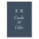 Guide your guests with elegance using our Cards & Gifts Dusty Slate Monogram Table Sign. Against a calming slate blue background, sleek monograms in white adorn this sign, seamlessly directing guests to the designated cards and gifts area. This sign adds a touch of sophistication to your event decor.