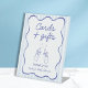 Guide guests with this charming Cards & Gifts baby shower sign designed in a light blue, blue, and white palette. The artwork features cute hand-drawn soda bottles tied with bows, a playful wavy frame, and a soft striped background that complements a She’s Ready to Pop baby boy theme. The handwritten-style font adds a warm, welcoming touch—perfect for decorating your gift table, entry area, or favor display.