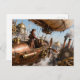 A woman skillfully pilots her airship through clock towers, smokestacks, and domes on this charming steampunk postcard.