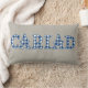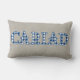 A fun lumbar pillow with the Welsh word 'CARIAD' filled with a pretty blue check pattern on a hessian-colored (burlap) background. Perfect gift for the one you love!