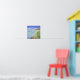 Pretty tropical beach scene with a boat and a palm tree, on this art print.