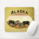 Two caribou bulls wrestle during the fall rut in the far north while the sun sets in the background. Text reading "Alaska" also appears. The image is superimposed on a braintan leather background.