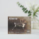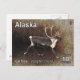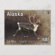 A 10-Nugget postage stamp issued by a imaginary independent nation of Alaska. It features a bull Caribou (Rangifer tarandus) superimposed on a Caribou pelt. Text reading, "Alaska," "POSTAGE 10 NUGGETS," "Caribou," and "Rangifer tarandus" also appears. The Caribou, known as the reindeer outside of North America, is a deer of the Arctic and Subarctic. While overall widespread and numerous, some subspecies are rare and one has gone extinct. The Inuit word tuktu means - deer that never stops moving. Caribou are always on the move, going north to calve, heading for the winter grounds, and south in the summer. Caribou considerably in colour and size. Uniquely among deer, both genders grow antlers, though these are larger in the males and there are a few populations where females lack them completely. Caribou hunting and herding of semi-domesticated reindeer (for meat, hides, antlers, milk and transportation) are important to several Arctic and Subarctic people. Even far outside its range, the caribou/reindeer is well known due to the myth, probably originating in early 19th century America, in which Santa Claus's sleigh is pulled by flying reindeer, a popular secular element of Christmas. In actual Lapland, reindeer would pull a pulk. Distribution and habitat The caribou/reindeer is a widespread and numerous species in the northern Holarctic, being present in both tundra and taiga (boreal forest). It was originally was found in Scandinavia, eastern Europe, Russia, Mongolia, and northern China north of the 50th latitude. In North America, it was found in Canada, Alaska (USA), and the northern conterminous USA from Washington to Maine. In the 19th century, it was apparently still present in southern Idaho. It also occurred naturally on Sakhalin, Greenland, and probably even in historical times in Ireland. During the late Pleistocene era, reindeer were found as far south as Nevada and Tennessee in North America and Spain in Europe.Today, then species has disappeared from many areas within this large historical range, especially from the southern parts, where it vanished almost everywhere. Large populations are still found in Norway, the Markku region of Finland, Sweden, Siberia, Greenland, Alaska, and Canada. Domesticated reindeer are mostly found in northern Fennoscandia and Russia, with a herd of approximately 150-170 reindeer living around the Cairngorms region in Scotland. The last remaining wild tundra reindeer in Europe are found in portions of southern Norway. A few reindeer from Norway were introduced to the South Atlantic island of South Georgia in the beginning of the 20th century. Today, there are two distinct herds still thriving there, permanently separated by glaciers. Their total numbers are no more than a few thousand. The flag and the coat of arms of the territory contain an image of a reindeer. Around 4000 reindeer have been introduced into the French sub-Antarctic archipelago of Kerguelen Islands. East Iceland has a small herd of about 2500–3000 animals. Caribou and reindeer numbers have fluctuated historically, but many herds are in decline across their range. This global decline is linked to climate change for northern, migratory caribou and reindeer herds and industrial disturbance of caribou habitat for sedentary, non-migratory herds. Fur Fur colour varies considerably, both individually, and depending on season and subspecies. Northern populations, which usually are relatively small, are whiter, while southern populations, which typically are relatively large, are darker. This can be seen well in North America, where the northermost subspecies, the Peary Caribou, is the whitest and smallest subspecies of the continent, while the southermost subspecies, the Woodland Caribou, is the darkest and largest. The coat has two layers of fur, a dense woolly undercoat and longer-haired overcoat consisting of hollow, air-filled hairs. Antlers Reindeer antlers grow again each year under a layer of fur called velvet. In most populations both sexes grow antlers, which (in the Scandinavian variety) for old males fall off in December, for young males in the early spring, and for females in the summer. The antlers typically have two separate groups of points, a lower and upper. Domesticated reindeer are shorter-legged and heavier than their wild counterparts. There is considerable subspecific variation in the size of the antlers (e.g., rather small and spindly in the northernmost subspecies), but in some subspecies the bull reindeer's antlers are the second largest of any extant deer, after the moose, and can range up to 39 inches (100 cm) in width and 53 inches (135 cm) in beam length. They have the largest antlers relative to body size among deer.Antler size plays a significant role in establishing group hierarchy. Nose and hooves Reindeer have specialised noses featuring nasal turbinate bones that dramatically increase the surface area within the nostrils. Incoming cold air is warmed by the animal's body heat before entering the lungs, and water is condensed from the expired air and captured before the deer's breath is exhaled, used to moisten dry incoming air and possibly absorbed into the blood through the mucous membranes. Reindeer hooves adapt to the season: in the summer, when the tundra is soft and wet, the footpads become sponge-like and provide extra traction. In the winter, the pads shrink and tighten, exposing the rim of the hoof, which cuts into the ice and crusted snow to keep it from slipping. This also enables them to dig down (an activity known as "cratering") through the snow to their favourite food, a lichen known as reindeer moss. The knees of many species of reindeer are adapted to produce a clicking sound as they walk. Diet Reindeer are ruminants, having a four-chambered stomach. They rely primarily on lichens in winter, especially reindeer moss. However, they also eat the leaves of willows and birches, as well as sedges and grasses. There is some evidence to sugges