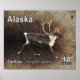 A 10-Nugget postage stamp issued by a imaginary independent nation of Alaska. It features a bull Caribou (Rangifer tarandus) superimposed on a Caribou pelt. Text reading, "Alaska," "POSTAGE 10 NUGGETS," "Caribou," and "Rangifer tarandus" also appears. The Caribou, known as the reindeer outside of North America, is a deer of the Arctic and Subarctic. While overall widespread and numerous, some subspecies are rare and one has gone extinct. The Inuit word tuktu means - deer that never stops moving. Caribou are always on the move, going north to calve, heading for the winter grounds, and south in the summer. Caribou considerably in colour and size. Uniquely among deer, both genders grow antlers, though these are larger in the males and there are a few populations where females lack them completely. Caribou hunting and herding of semi-domesticated reindeer (for meat, hides, antlers, milk and transportation) are important to several Arctic and Subarctic people. Even far outside its range, the caribou/reindeer is well known due to the myth, probably originating in early 19th century America, in which Santa Claus's sleigh is pulled by flying reindeer, a popular secular element of Christmas. In actual Lapland, reindeer would pull a pulk. Distribution and habitat The caribou/reindeer is a widespread and numerous species in the northern Holarctic, being present in both tundra and taiga (boreal forest). It was originally was found in Scandinavia, eastern Europe, Russia, Mongolia, and northern China north of the 50th latitude. In North America, it was found in Canada, Alaska (USA), and the northern conterminous USA from Washington to Maine. In the 19th century, it was apparently still present in southern Idaho. It also occurred naturally on Sakhalin, Greenland, and probably even in historical times in Ireland. During the late Pleistocene era, reindeer were found as far south as Nevada and Tennessee in North America and Spain in Europe.Today, then species has disappeared from many areas within this large historical range, especially from the southern parts, where it vanished almost everywhere. Large populations are still found in Norway, the Markku region of Finland, Sweden, Siberia, Greenland, Alaska, and Canada. Domesticated reindeer are mostly found in northern Fennoscandia and Russia, with a herd of approximately 150-170 reindeer living around the Cairngorms region in Scotland. The last remaining wild tundra reindeer in Europe are found in portions of southern Norway. A few reindeer from Norway were introduced to the South Atlantic island of South Georgia in the beginning of the 20th century. Today, there are two distinct herds still thriving there, permanently separated by glaciers. Their total numbers are no more than a few thousand. The flag and the coat of arms of the territory contain an image of a reindeer. Around 4000 reindeer have been introduced into the French sub-Antarctic archipelago of Kerguelen Islands. East Iceland has a small herd of about 2500–3000 animals. Caribou and reindeer numbers have fluctuated historically, but many herds are in decline across their range. This global decline is linked to climate change for northern, migratory caribou and reindeer herds and industrial disturbance of caribou habitat for sedentary, non-migratory herds. Fur Fur colour varies considerably, both individually, and depending on season and subspecies. Northern populations, which usually are relatively small, are whiter, while southern populations, which typically are relatively large, are darker. This can be seen well in North America, where the northermost subspecies, the Peary Caribou, is the whitest and smallest subspecies of the continent, while the southermost subspecies, the Woodland Caribou, is the darkest and largest. The coat has two layers of fur, a dense woolly undercoat and longer-haired overcoat consisting of hollow, air-filled hairs. Antlers Reindeer antlers grow again each year under a layer of fur called velvet. In most populations both sexes grow antlers, which (in the Scandinavian variety) for old males fall off in December, for young males in the early spring, and for females in the summer. The antlers typically have two separate groups of points, a lower and upper. Domesticated reindeer are shorter-legged and heavier than their wild counterparts. There is considerable subspecific variation in the size of the antlers (e.g., rather small and spindly in the northernmost subspecies), but in some subspecies the bull reindeer's antlers are the second largest of any extant deer, after the moose, and can range up to 39 inches (100 cm) in width and 53 inches (135 cm) in beam length. They have the largest antlers relative to body size among deer.Antler size plays a significant role in establishing group hierarchy. Nose and hooves Reindeer have specialised noses featuring nasal turbinate bones that dramatically increase the surface area within the nostrils. Incoming cold air is warmed by the animal's body heat before entering the lungs, and water is condensed from the expired air and captured before the deer's breath is exhaled, used to moisten dry incoming air and possibly absorbed into the blood through the mucous membranes. Reindeer hooves adapt to the season: in the summer, when the tundra is soft and wet, the footpads become sponge-like and provide extra traction. In the winter, the pads shrink and tighten, exposing the rim of the hoof, which cuts into the ice and crusted snow to keep it from slipping. This also enables them to dig down (an activity known as "cratering") through the snow to their favourite food, a lichen known as reindeer moss. The knees of many species of reindeer are adapted to produce a clicking sound as they walk. Diet Reindeer are ruminants, having a four-chambered stomach. They rely primarily on lichens in winter, especially reindeer moss. However, they also eat the leaves of willows and birches, as well as sedges and grasses. There is some evidence to sugges
