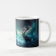 A caribou stands on a hillside, surrounded by tall evergreen trees. Below lays a lake, shrouded in mist and fog. Above lies a starry sky, illuminated by a magnificent display of the Northern Lights, shining in reds, yellows, and neon blues, with a diffused green glow all about.