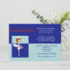 A charming and whimsical invitation featuring a caricature nurse holding an oversized hypodermic needle. The blue on blue boxed background is also trimmed with a pulse monitor graph.