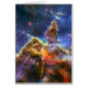 This photo of the Carina Nebula was taken by the Hubble Space Telescope. It is reminiscent of a sci-fi/fantasy illustration, and shows an enormous mountainous pillar of dust and gas in rich orange tones, against a starlit deep blue background.