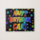 This exciting, vibrant, birthday-themed jigsaw puzzle design features the message "HAPPY BIRTHDAY, CARL" with the characters having a colorful rainbow spectrum inspired gradient pattern, in addition to a fun stars background pattern. A colorful puzzle like this might be used to send birthday greetings to somebody named Carl. [~Z0000468]