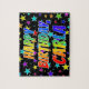 This lively, vibrant, birthday-themed jigsaw puzzle design features the message "HAPPY BIRTHDAY, CARLA" with the characters having a colourful rainbow spectrum inspired gradient pattern, along with a fun stars background pattern. A vibrant puzzle like this might be used to send birthday greetings to somebody named Carla. [~Z0000468]