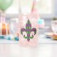 A harlequin pattern of green and purple is transformed into a playful argyle with an overlay of gold diamond outlines and fleur de lis, creating a fun and colourful pattern perfect for any New Orleans influenced Mardi Gras celebration. The pattern is masked behind the silhouette of a fleur de lis to add a fun final note. This glassware is also available in stemless wine glass and rocks styles.