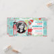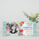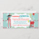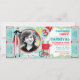 Stilt walkers, cotton candy, and balloons carnival theme birthday card with photo insert in blues, red, white, and yellow with raffle tickets at side. Just perforate the sides for an easy tear off!