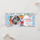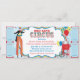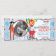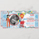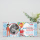 Stilt walker juggling and cotton candy booth with balloons circus or carnival theme birthday invitation card with photo insert and raffle tickets at side. Just perforate the sides for an easy tear off! Colours are blues, yellow, red, and white.
