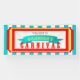 This classic, vintage style carnival party banner features a background of teal blue and white vertical stripes. A ticket-shaped, red and yellow sign frames a paper design centre to resemble an old poster.