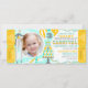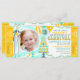 Stilt walkers, carnival tent cake, and balloons carnival theme birthday card with photo insert in yellow, aqua, white, and grey with raffle tickets at side. Just perforate the sides for an easy tear off!