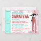 Fun carnival theme birthday invitation card with stilt walker, cotton candy, and balloons in pinks, aqua, red, and white.