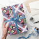 Stained Glass Style Carolers in blue, green, and black feature an original Kellar Card vintage linoleum hand-cut block print design with two stylised carolers holder their music beneath and a street lamp. Decorate your home, your friend’s mailboxes or fill those boxes under the tree this Christmas season with an original linoleum hand-cut block print design and enjoy a decorative retro holiday season this year!