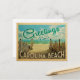 This Greetings From Carolina Beach vintage postcard design features a sandy beach with a beautiful turquoise ocean water and above the sea, a blue sky with billowy white clouds. In vintage travels style.