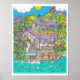 Fun Island house in Sandy Bay, Roatan. Coloured pencil illustration with Carol, jazzy and friend hanging out enjoying the Dolphins jumping.
