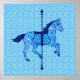 Mixed media digital graphic of a classic carousel horse, in mixed patterns, against an arabesque tiled background - Dark cobalt blue, shades of sky blue, and white