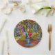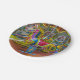 A colorful photograph of carousel horses printed on a paper plate.