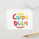 Carpe Diem, Seize The Day design shows hand drawn colorful lettering with the the sun rising above and a big smile below. Make the most of today!