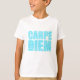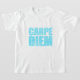 Typographic design of Carpe Diem with abstract waves. Blue Carpe Diem shirt.