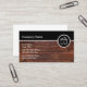Carpenter business cards design template created with simulated woodgrain art printed as a background on the front and simple text layout you can customise online including a house symbol and emblem for a carpenter, cabinet maker, or kitchen and bath remodeling service.