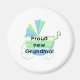 A baby carriage in blue, green, and yellow and text that reads "Proud New Grandma" on baby announcement buttons.