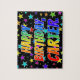 This exciting, lively, birthday-themed jigsaw puzzle design features the message "HAPPY BIRTHDAY, CARTER" with the characters having a colourful rainbow spectrum inspired gradient pattern, along with a fun field of stars background pattern. A vibrant puzzle like this might be used to send birthday wishes to somebody named Carter. [~Z0000468]