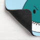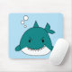Cute cartoon blue and white shark with black ovals for eyes and big sharp pointed teeth. He is blowing white bubbles on a blue background.