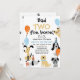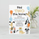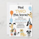 Cute dog themed 2nd birthday invitation in a slight cartoon like style, featuring various dogs, balloons, party hats and bone illustration. This bad two the bone birthday invitation also features some black paw prints on the back.