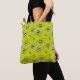 Fun green and yellow tote bag featuring a colourful pattern of Bumblebees buzzing about a beehive.