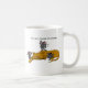 Three mice dance over a grumpy cat for a humourous cartoon coffee mug. The message, "Not until I've had my coffee!" can be modified for a personalised gift. Original cartoon by Linda Becker.