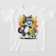 Fun cartoon T-shirt design featuring a playful cat chasing a mouse with cheese. Bright colours, comic explosion background, and dynamic art style make it perfect for casual wear.