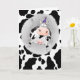 Springy Happy Birthday Cartoon Cow on cow print card front bouncing by to wish you an "Udder-ly" Amazing Birthday!