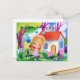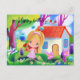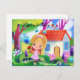 Cartoon cute girl and house in forest. Flowers fairy tale