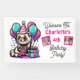 Cute pink ferret with a funny pun girl's birthday party banner which can be personalised with your daughter's pictures, name and age. A cute ferret in a birthday hat, with gifts and pink, purple and teal balloons celebrating a birthday.