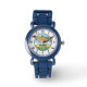 This personalized kids' watch features a bright yellow and red cartoon firefighting seaplane soaring over a cheerful forest of smiling trees within a striking circular badge.