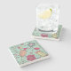 The coasters are gorgeous, a quality feel and heavy weight. They look like a precious archeological find. A rustic stone juxtaposed with a modern floral black and white print. I like the way the print goes slightly imperfect on the cut stone edges giving them a kind-of natural beauty.
