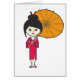 Cartoon illustration of a Geisha Lady. She is wearing a hot pink kimono, pink slippers and green eye shadow. Her black hair is up in a bun and she's carrying a umbrella / parasol.