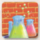 Cartoon Glass Science equipment on a bench, a collection of scientific glass experimental objects sitting on a wooden bench in front of a brick wall.