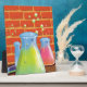 Cartoon Glass Science equipment on a bench, a collection of scientific glass experimental objects sitting on a wooden bench in front of a brick wall.