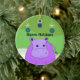 A fun design featuring a cartoon hippo with snowflakes and Christmas decorations above him. A green shaded background.