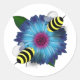 Cartoon Honey Bees Meeting on Blue Flower Classic Round Sticker