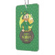 Air Freshenert with an Illustration of a smiling leprechaun wearing a green suit, a bow-tie, and a bowler hat while sitting inside a pot o’ gold and holding a pint of beer, with yellow, green, and orange rainbow in the background. The image is placed over a seamless dark green background with shamrocks.