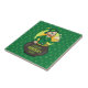 Ceramic Tile with an Illustration of a smiling leprechaun wearing a green suit, a bow-tie, and a bowler hat while sitting inside a pot o’ gold and holding a pint of beer, with yellow, green, and orange rainbow in the background. The image is placed over a seamless dark green background with shamrocks.